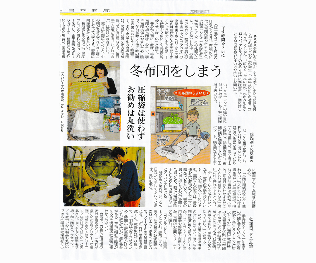 【メディア情報】2020年4月10日付 西日本新聞 2020.04.10 2020年4月10日付の西日本新聞の特集「冬布団のしまい方」にてインタビュー取材していただきました。 誤ってせっかくのお布団が台無しになってしまった… そんなことを防ぐための布団の片付け方についてお答えしております! 電子版はこちらよりご覧ください。